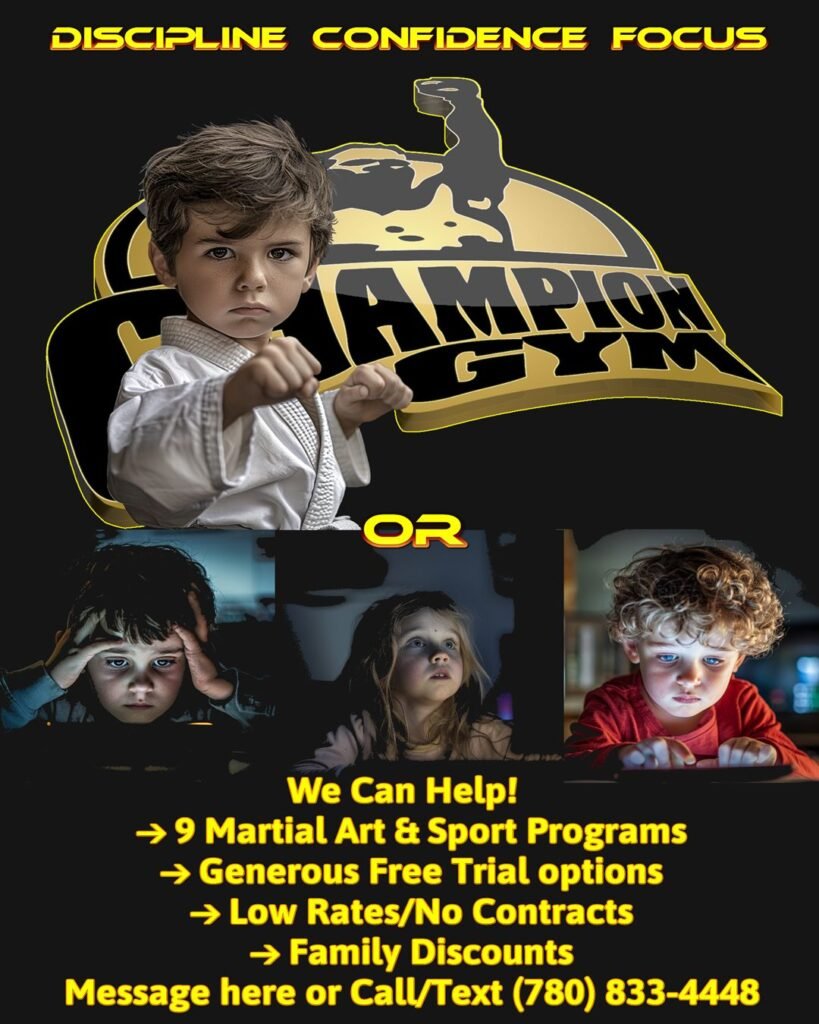 Ready to give your child a head start in fitness, focus, and fun? At Champion Gym, we offer a free trial so you can experience our safe and encouraging atmosphere firsthand. With every class, kids gain real skills, build confidence, and leave with big smiles. Whether they’re punching, kicking, flipping, or climbing, they’ll be training in a space designed to help them grow. 👉 Call or text (780) 833-4448 or drop by Champion Gym in Grande Prairie today. Let them play. Let them train. Let them become Champions.